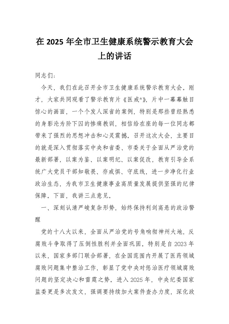 在2025年全市卫生健康系统警示教育大会上的讲话
