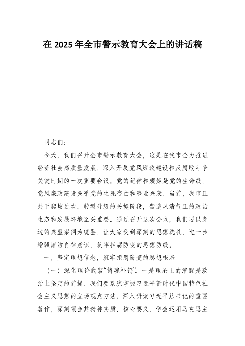 首页讲课讲稿在2025年全市警示教育大会上的讲话稿