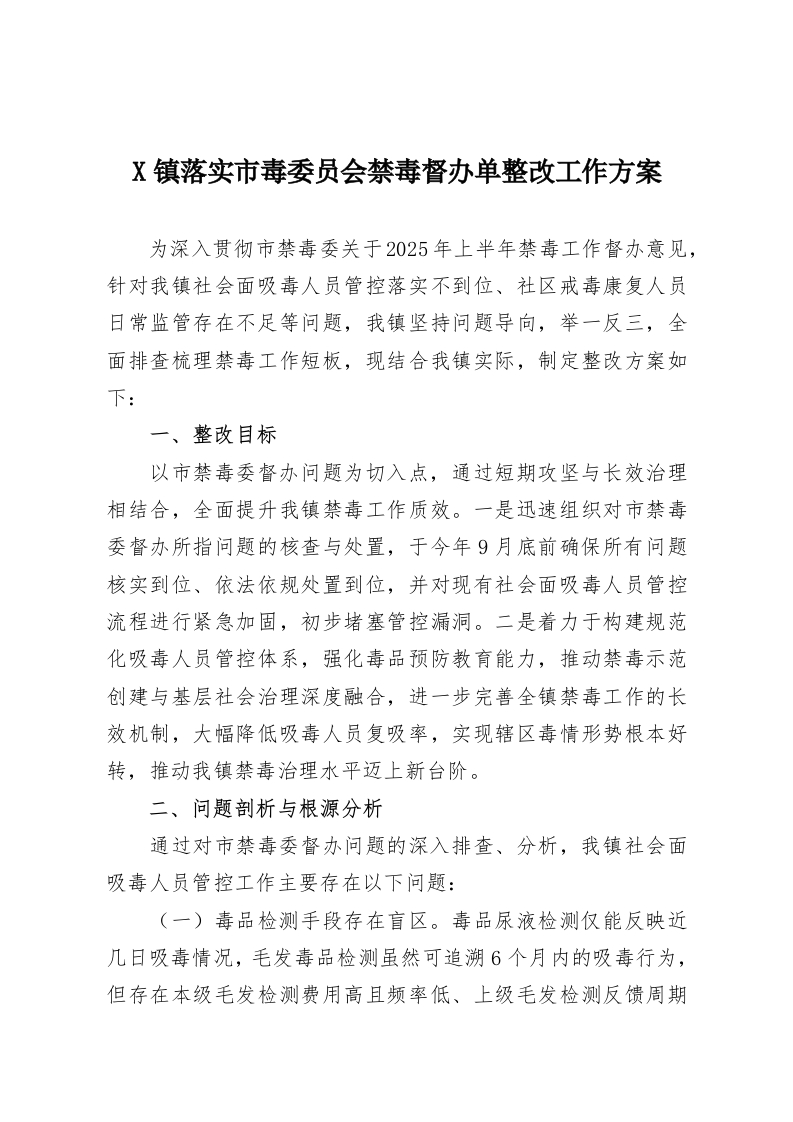 X镇落实市毒委员会禁毒督办单整改工作方案