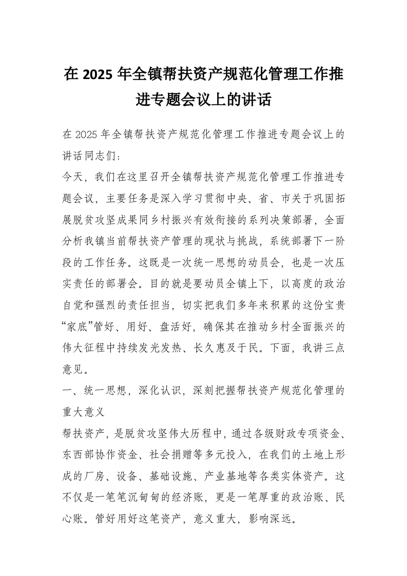 在2025年全镇帮扶资产规范化管理工作推进专题会议上的讲话