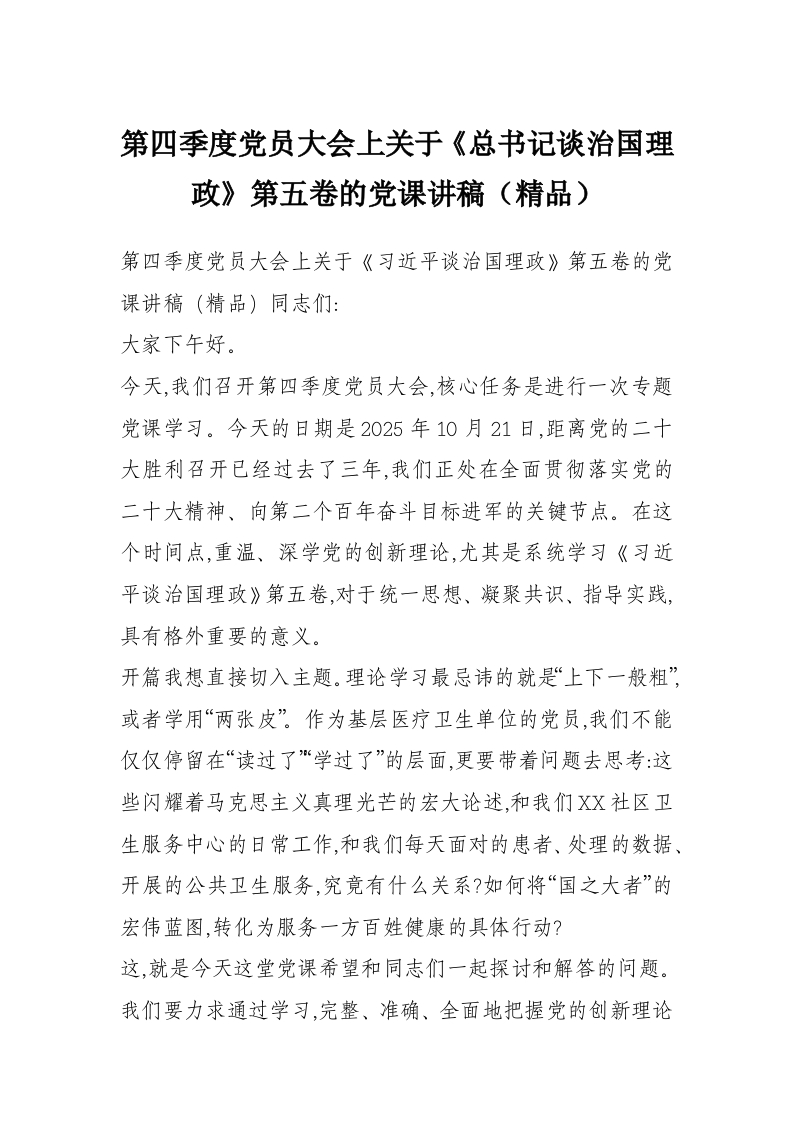第四季度党员大会上关于《总书记谈治国理政》第五卷的党课讲稿(精品)