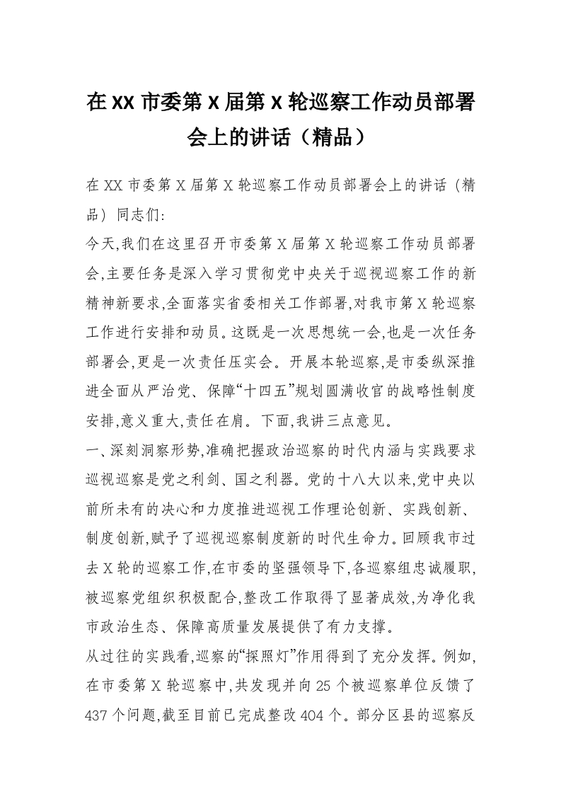 在XX市委第X届第X轮巡察工作动员部署会上的讲话(精品)