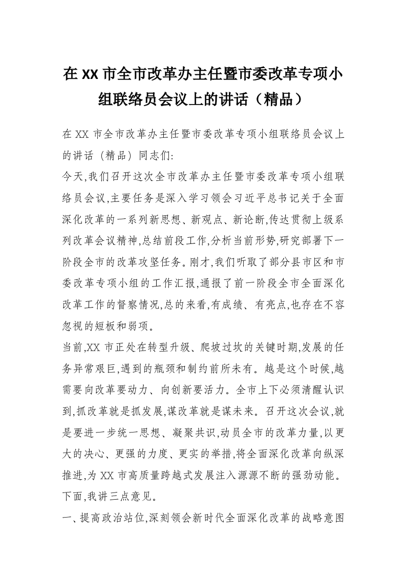 在XX市全市改革办主任暨市委改革专项小组联络员会议上的讲话(精品)