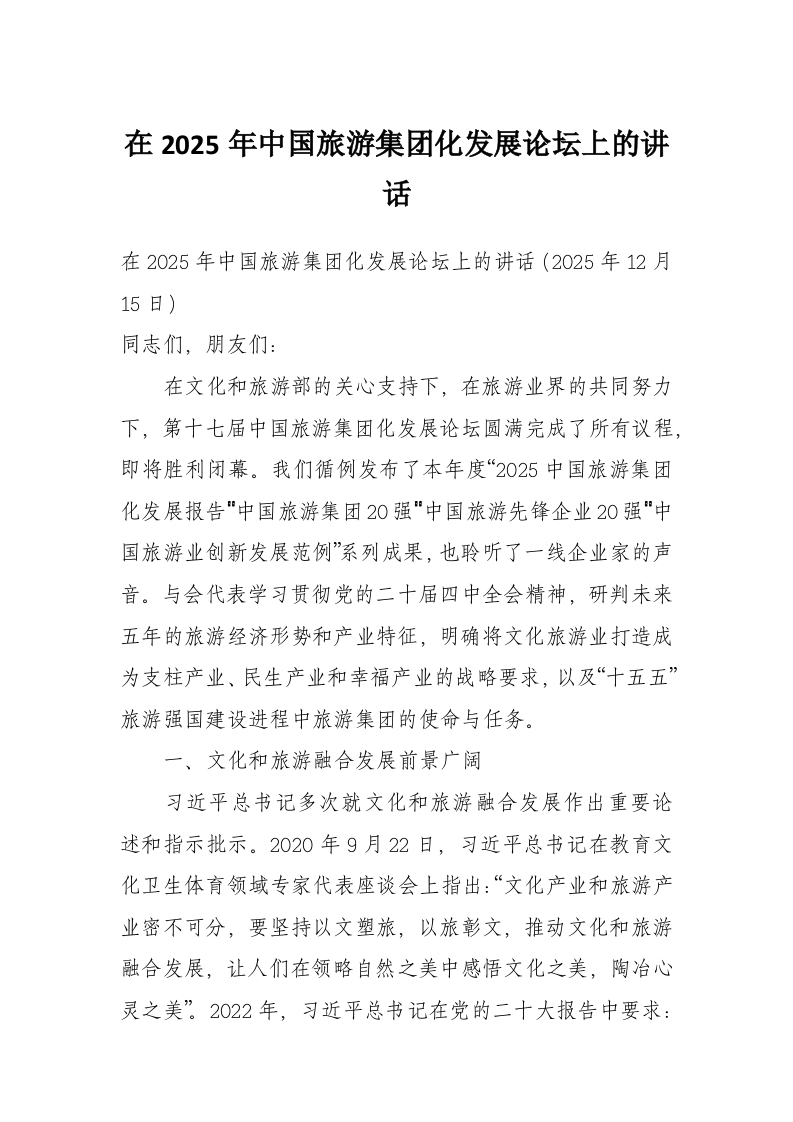 首页讲课讲稿在2025年中国旅游集团化发展论坛上的讲话