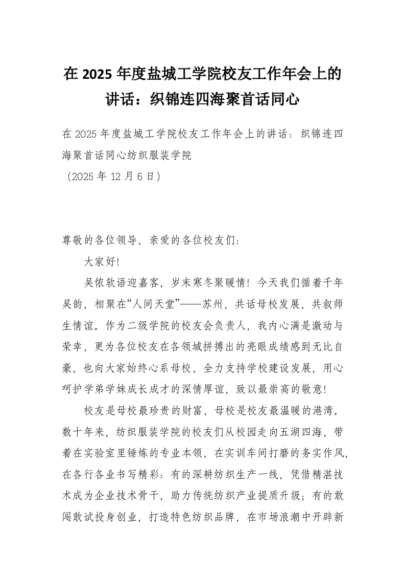 首页讲课讲稿在2025年度盐城工学院校友工作年会上的讲话:织锦连四海聚首话同心