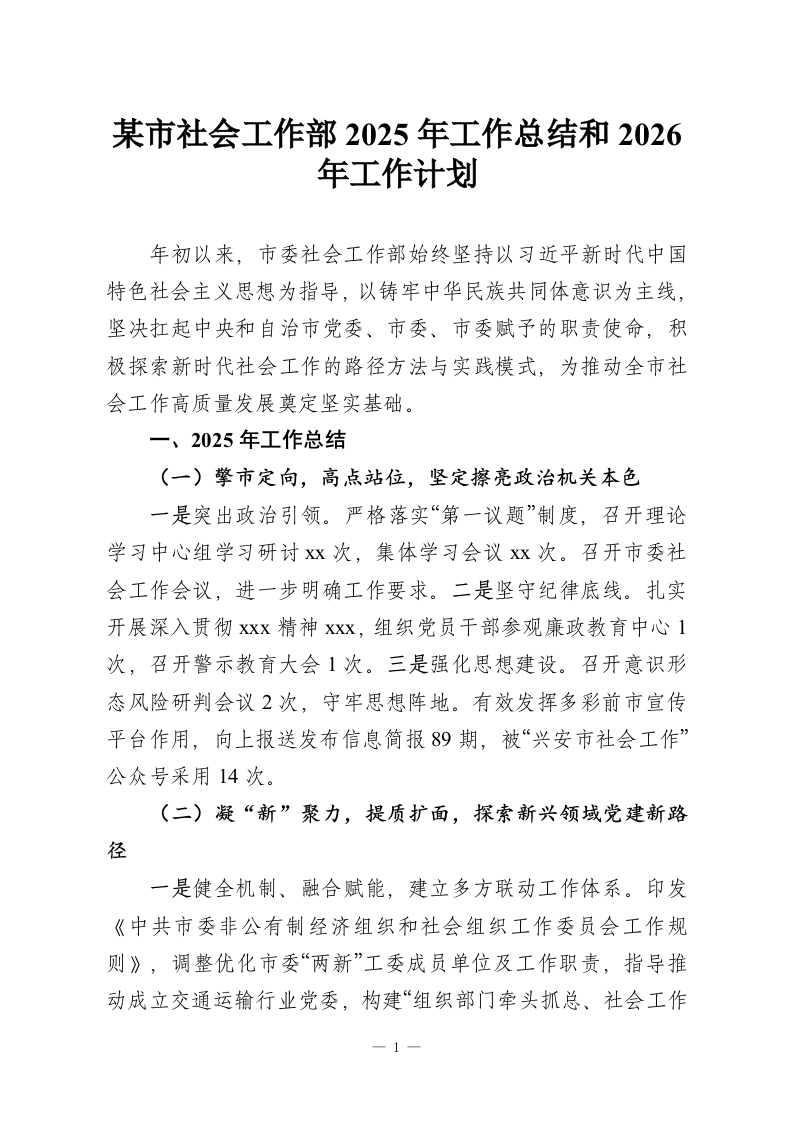 某市社会工作部2025年工作总结和2026年工作计划