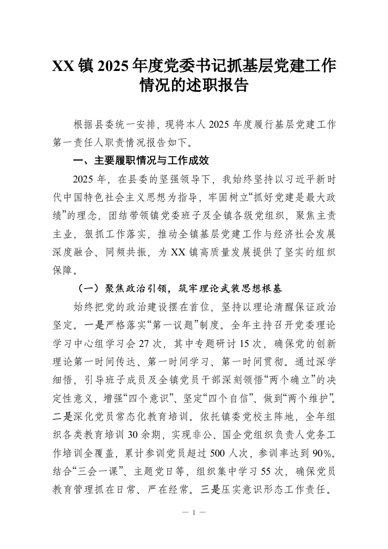 XX镇2025年度党委书记抓基层党建工作情况的述职报告