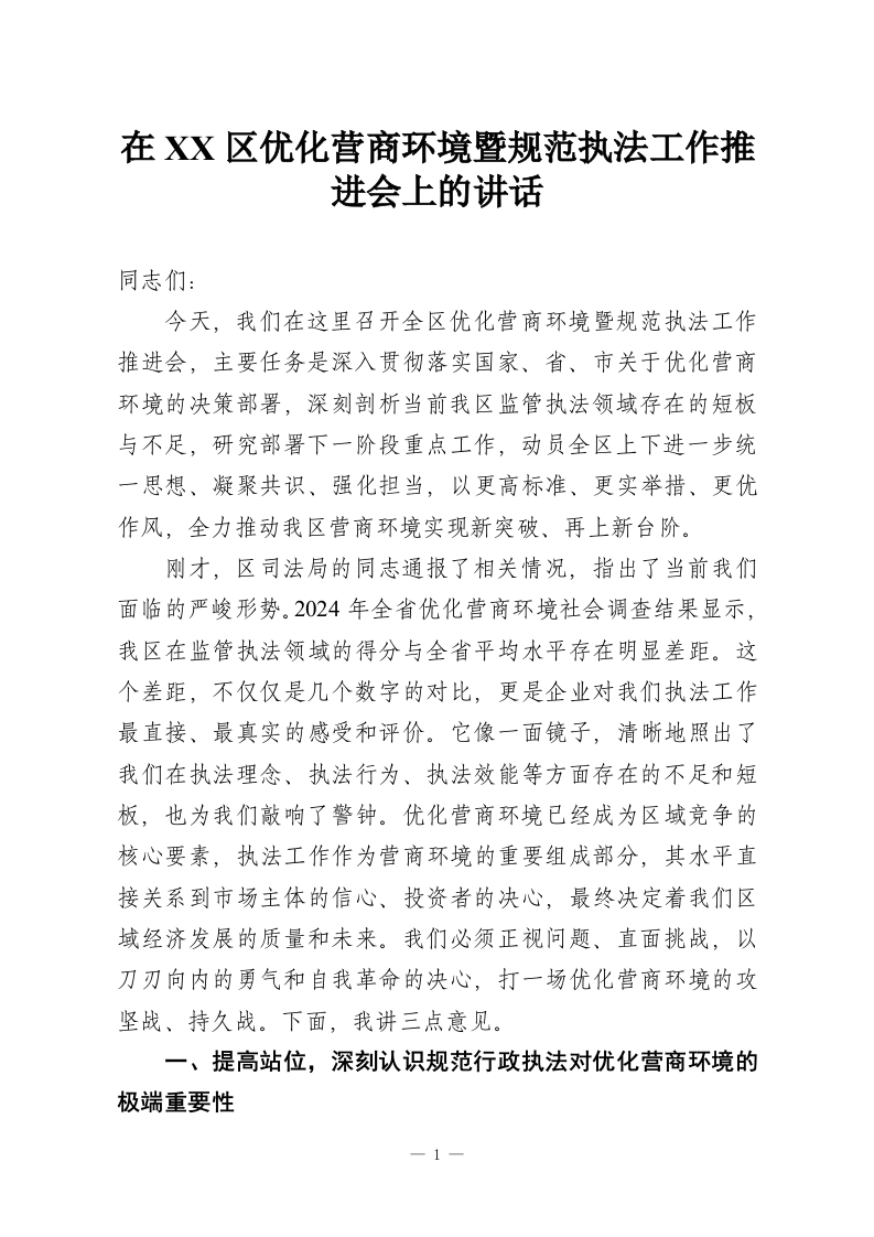 在XX区优化营商环境暨规范执法工作推进会上的讲话