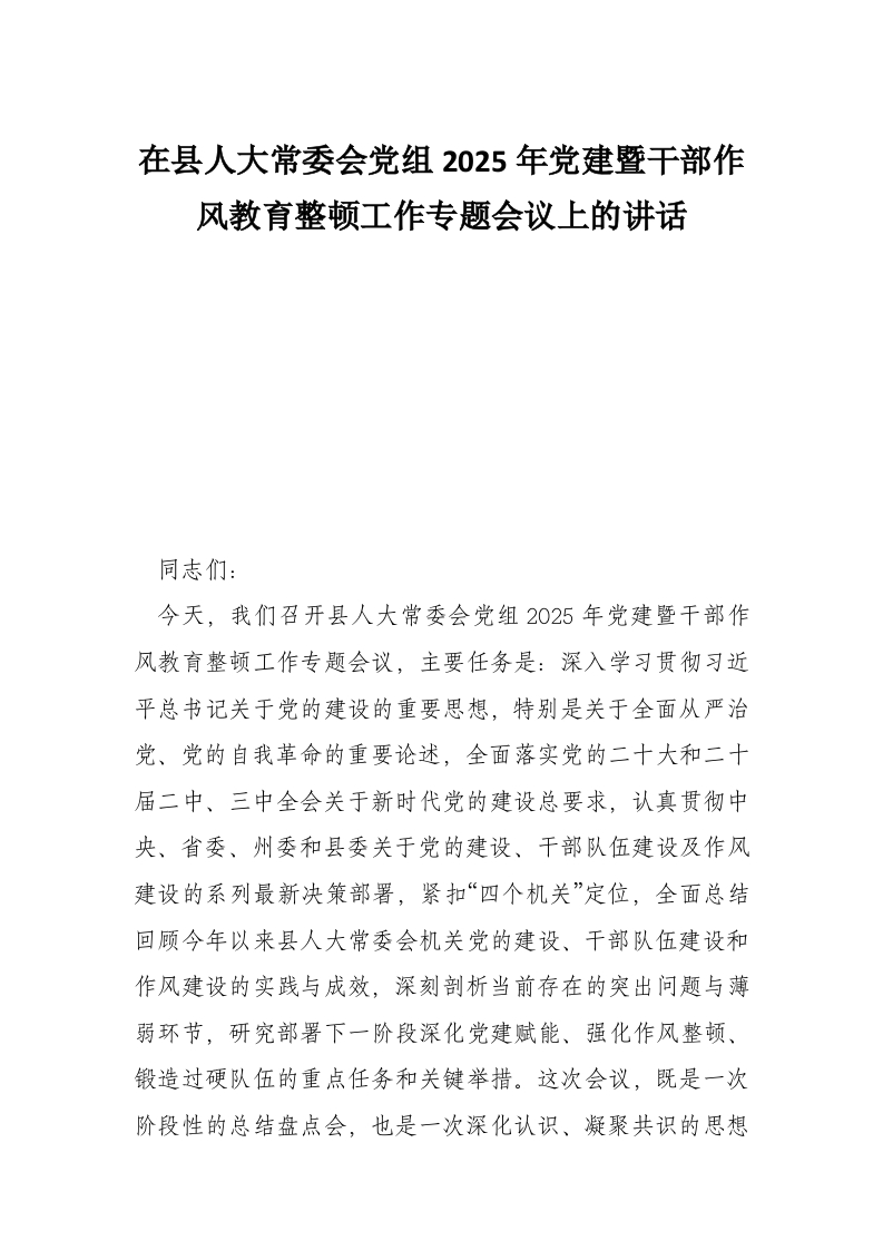 在县人大常委会党组2025年党建暨干部作风教育整顿工作专题会议上的讲话