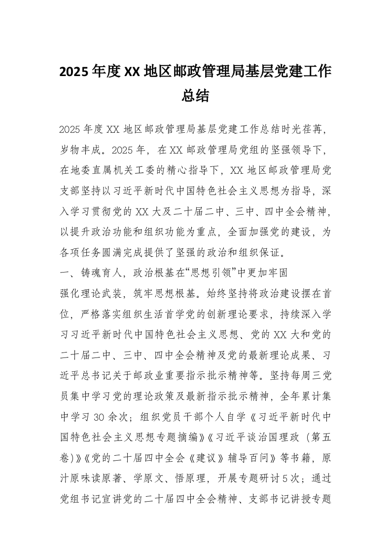 2025年度XX地区邮政管理局基层党建工作总结