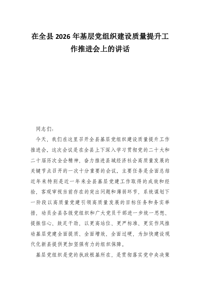 首页工作文档在全县2026年基层党组织建设质量提升工作推进会上的讲话