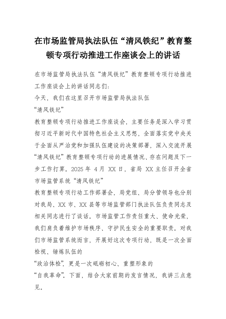 在市场监管局执法队伍“清风铁纪”教育整顿专项行动推进工作座谈会上的讲话