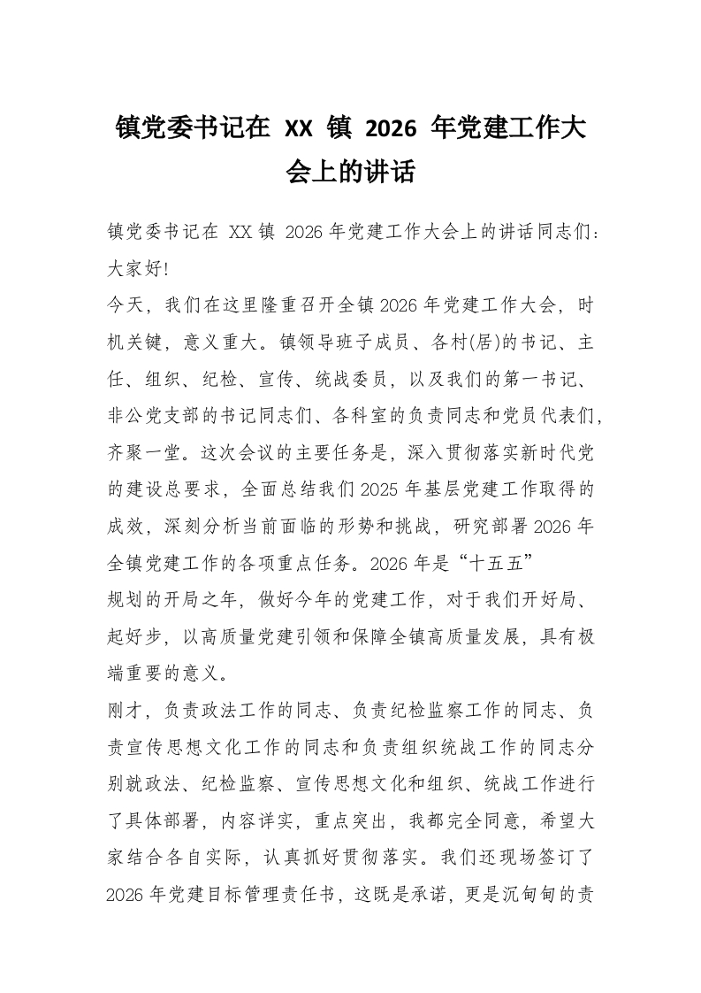 - 镇党委书记在全镇2026年党建工作大会上的讲话