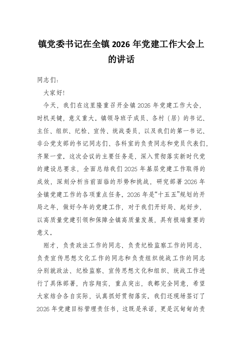 首页工作文档镇党委书记在全镇2026年党建工作大会上的讲话
